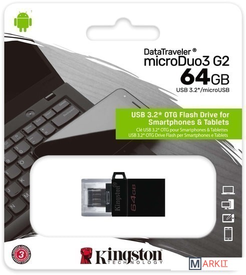Флеш-накопители DataTraveler microDuo от компании Kingston имеют компактный форм-фактор и предоставляют дополнительную память для планшетов и смартфонов, поддерживающих функцию USB OTG (On-The-Go). Стандарт USB OTG позволяет напрямую подключать мобильные устройства к поддерживаемым USB-устройствам.Флеш-накопители DataTraveler microDuo емкостью до 128ГБ позволяют использовать разъемы microUSB, часто применяемые для зарядки устройств, в качестве портов расширения памяти. DTDUO3G2 идеально подходит для хранения больших файлов в путешествиях, обеспечивая функцию plug-and-play в планшетах и смартфонах Android без разъемов microSD; при этом цена на гигабайт у накопителя ниже, чем у дополнительных встроенных накопителей для мобильных устройств.