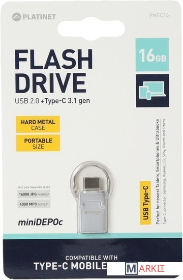 Markit » Флешки USB » USB Flash Platinet miniDEPOc + Type-C Adapter 16GB (серебристый)