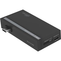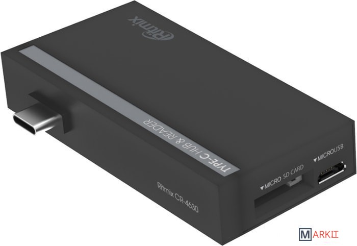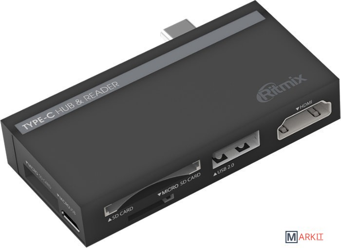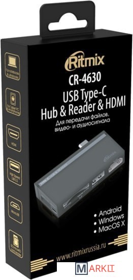 Ritmix CR-4630 — это мультиадаптер позволяющий передавать данные, видео и аудио сигнал. CR-4630 снабжён штекером USB тип C, гнездом USB тип A с поддержкой передачи данных по стандарту USB 2.0, портом HDMI с возможностью передачи видео до 4К/30Hz и 1080p/60Hz и поддержкой EDID и MCCS, разъёмом для SD карты и двумя разъёмами для MicroSD карт. Для использования не требуется установка дополнительных драйверов.