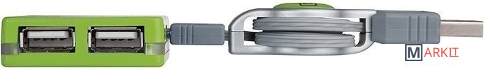 Внешний четырехпортовый концентратор USB 2.0. Концентратор имеет квадратную форму, в которой два USB-порта расположены слева и справа. Максимальная скорость передачи 480 Мбит/с. Он включает в себя убирающийся кабель с возвратным механизмом длиной 0,6 м.