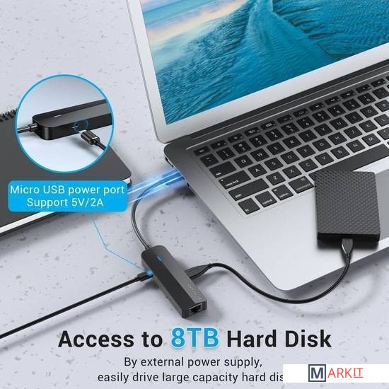 Все разъемы на адаптере USB-A 2.0, RJ-45, microUSB 2.0