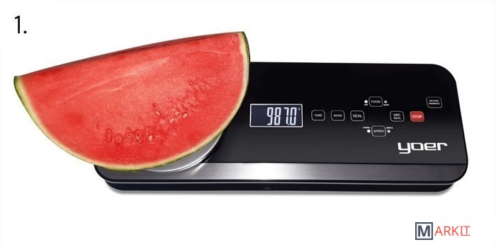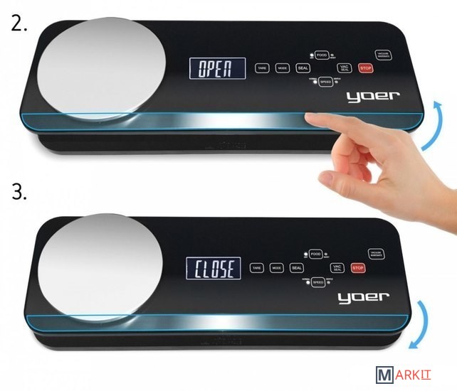 Вакуумный упаковщик оснащен встроенными весами (максимальная нагрузка 2 кг, точность до 0,1 г).Открытие и закрытие крышки «одним касанием» - открыть и закрыть крышку можно одним касанием металлической планки, расположенного по всей длине передней части упаковщика.