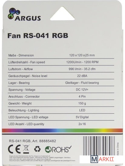 Markit » Системы охлаждения » Вентилятор для корпуса Inter-Tech Argus RS-041 RGB