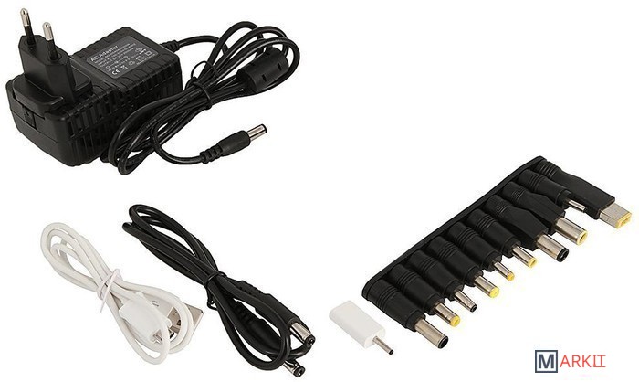 В комплект поставки входит кабель USB A -> microB - подходит для зарядки устройств с разъемом USB microB от аккумулятора. Остальные устройства с возможностью подзарядки от USB необходимо заряжать с помощью их собственного USB кабеля. Подходит для зарядки большинства современных ноутбуков (10 различных адаптеров для ноутбуков в комплекте)